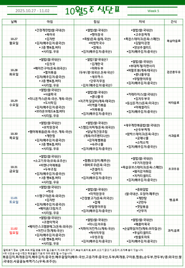 10월 5주 식단표