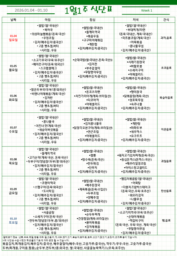 1월 1주 식단표
